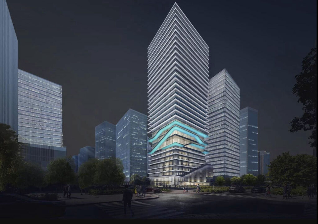 - Podium Surge – “Talent Gateway”: The base pulses with warm 3000K linear accents that cascade like data streams, welcoming over 10,000 AI, big data, and internet trailblazers. Subtle blue-green washes nod to Shenzhen Bay’s waters, blending the building seamlessly into its coastal canvas while activating collaborative lounges and innovation labs.