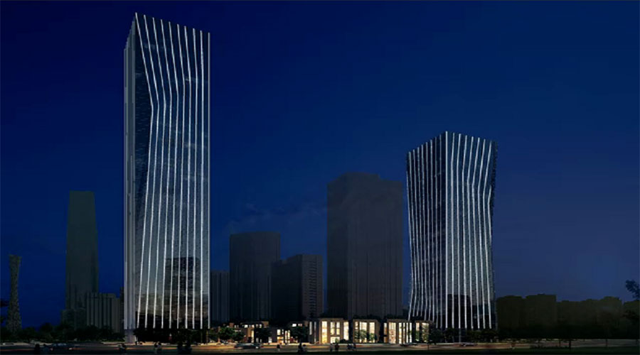 The façade lighting design blends modern minimalism with high-rise architecture, accentuating the tower’s glass curtain walls and structural rhythm.